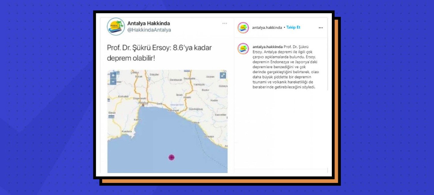 Bir Instagram sayfası tarafından 6 Aralık 2020 tarihinde yapılan paylaşımda Antalya Depremi hakkında Prof. Dr. Şükrü Ersoy’un 8.6’ya kadar deprem olabilir açıklaması yaptığı iddia edildi. Gönderi 1,5 milyondan fazla görüntülenme 94 binden fazla beğeni almış.