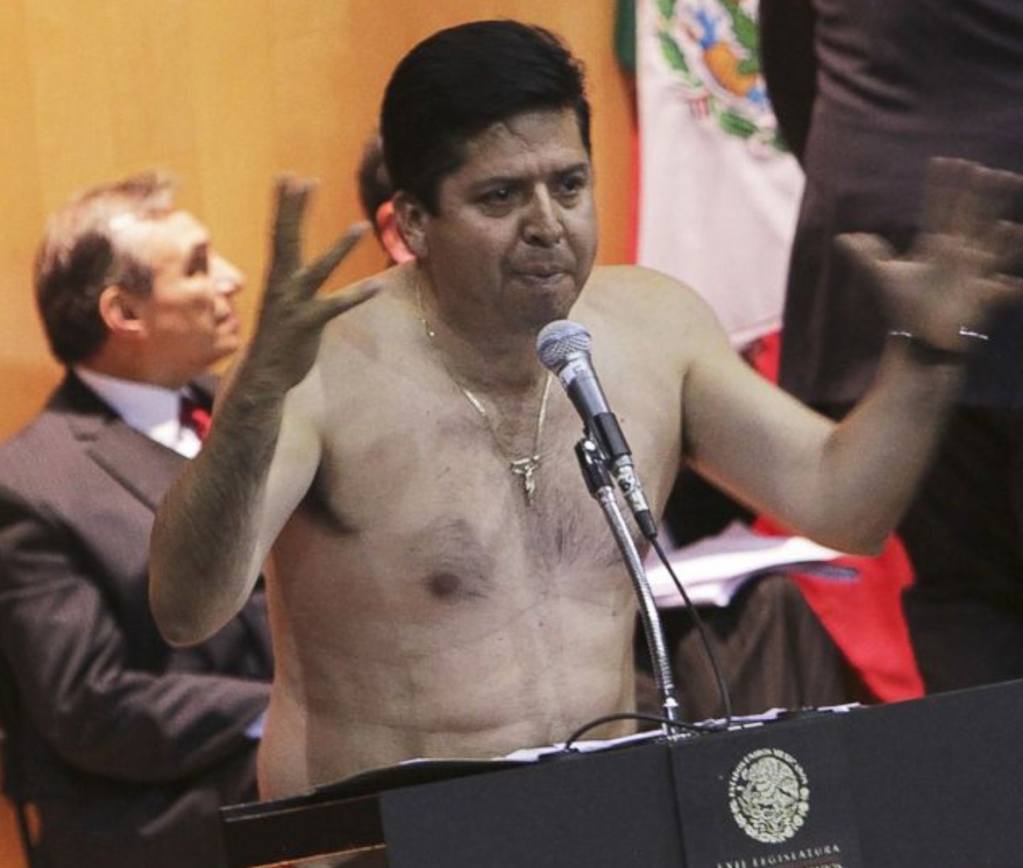 → Meksika Federal Meclisinde milletvekili olan Antonio García Conejo Aralık 2013’te mecliste görüşülen enerji yasasını eleştirmek için üzerindeki kıyafetleri çıkarmış.