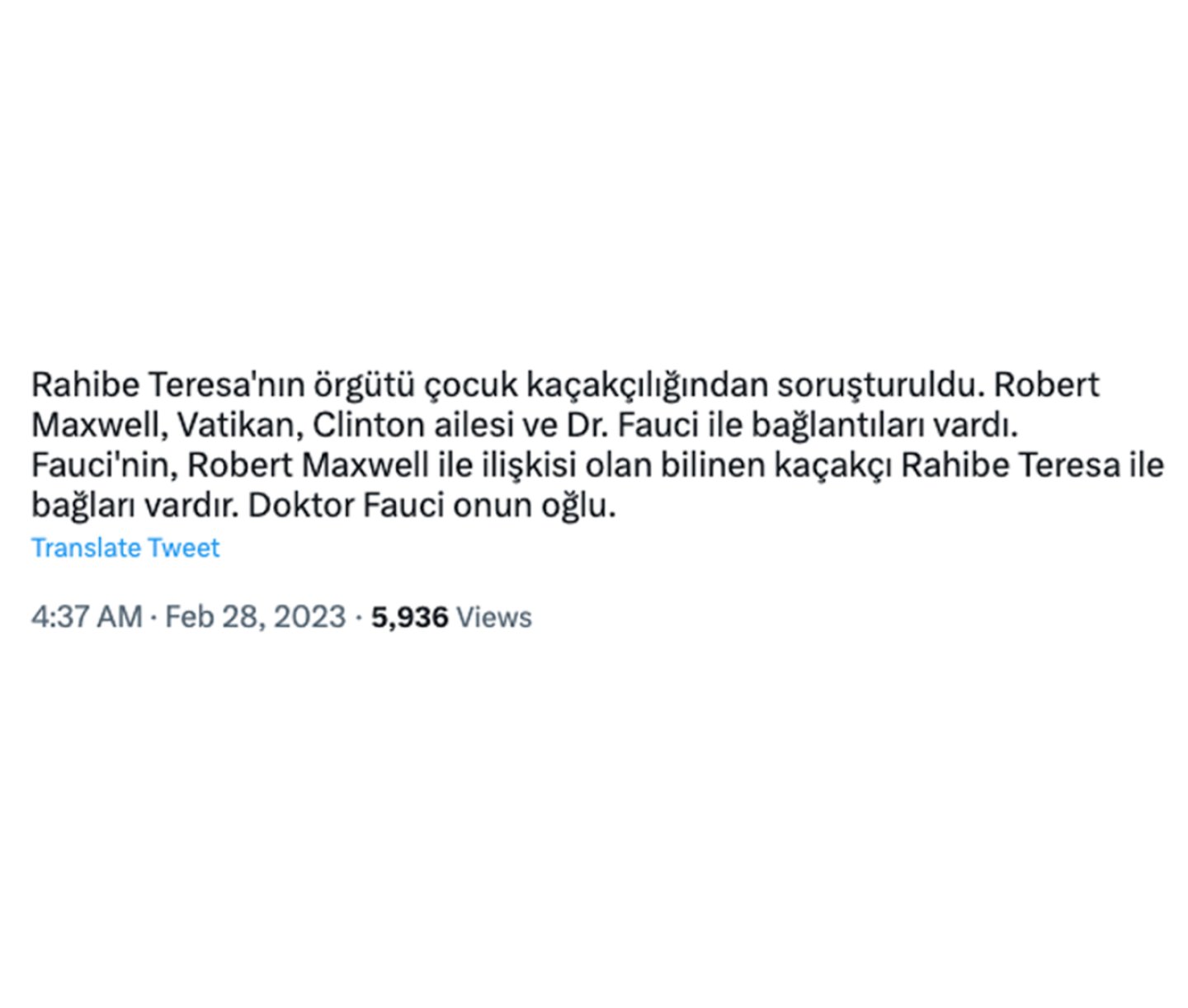Bir Twitter hesabı tarafından 28 Şubat 2023 tarihinde yapılan bir paylaşımda Anthony Fauci’nin Rahibe Teresa’nın oğlu olduğu ve Rahibe Teresa’nın çocuk kaçakçılığı yaptığı iddia edilmişti. İnsani yardım alanında sembol isimlerden olan Rahibe Teresa’ya yönelik çocuk kaçakçılığıyla ilgili bir hüküm bulunmuyor. Söylentinin kaynağı Hindistan’da Rahibe Teresa Vakfı çalışanlarından birkaçının çocuk kaçakçılığı suçlamasıyla soruşturulmuş olması. COVID-19 salgını döneminde ABD’de aşı karşıtı grupların hedefi haline gelen Dr. Anthony Fauci ve Rahibe Teresa arasında ise herhangi bir akrabalık bağı bulunmuyor.