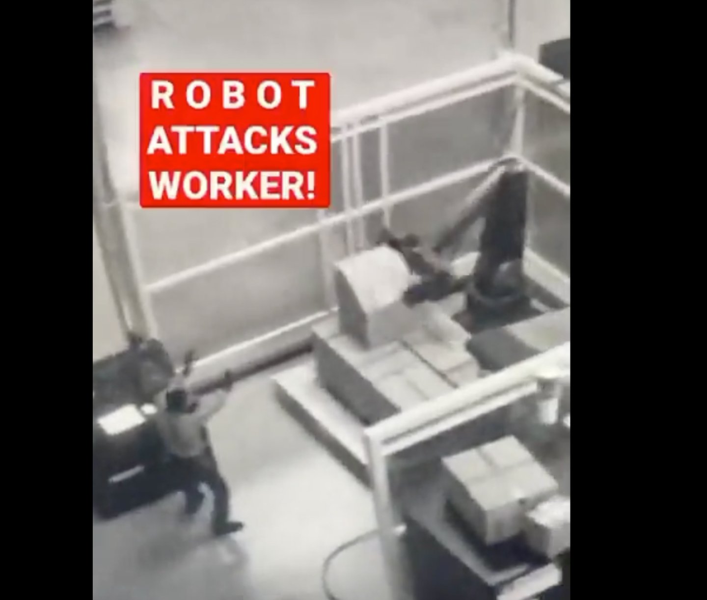 Sosyal medyada sıklıkla paylaşılan videoda, bir üretim hattında çalışan robotun fabrika işçisine saldırdığı anların gösterildiği iddia ediliyor. Siyah beyaz görüntülerde 2003 tarihi yer alıyor ve görüntüler bir güvenlik kamerasından kayıt edilmiş gibi görünüyor. Videoda yapılan açıklamalarda, bir makinenin üretim hattında bir hata yapmasının ardından, diğer robotun “sinirlendiği” ve bir işçiye saldırdığı gibi ifadeler yer alıyor. Görüntülerde robotlardan birinin önce etrafa vurduğu sonra da işçinin üzerine çevredeki kutuları fırlatarak “saldırdığı” anlar yer alıyor. Video aynı açıklamalar ile Twitter, Facebook; TikTok ve Instagram’da paylaşılmaya devam ediyor.