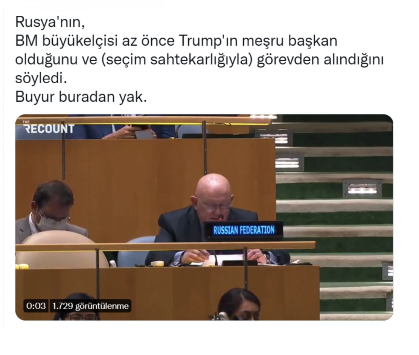 Bir Twitter hesabı tarafından 3 Mart 2022 tarihinde yapılan paylaşımda, Rusya BM Büyükelçisi’nin Trump’ın ABD’nin meşru başkanı olduğunu ve darbe ile indirildiğini söylediğiiddia edildi.