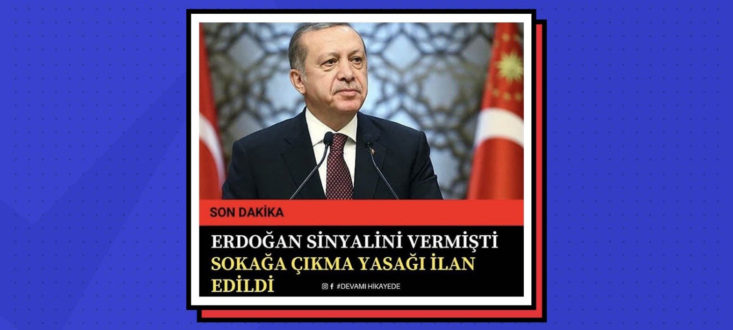 22 Eylül 2020 tarihinde bir Instagram kullanıcısı tarafından son dakika mesajıyla paylaşılan; Cumhurbaşkanı Erdoğan’ın sokağa çıkma yasağı uygulanacağına dair sinyaller vermesi ve sonrasında sokağa çıkma yasağı ilan edildiği iddiası, Cumhurbaşkanı Erdoğan’ın ilgili açıklamasında sokağa çıkma yasağı uygulamasından bahsetmemesi ve buna takiben İçişleri Bakanlığı’nın sokağa çıkma yasağı uygulanacağına dair bir genelgesi bulunmadığından yanlıştır.