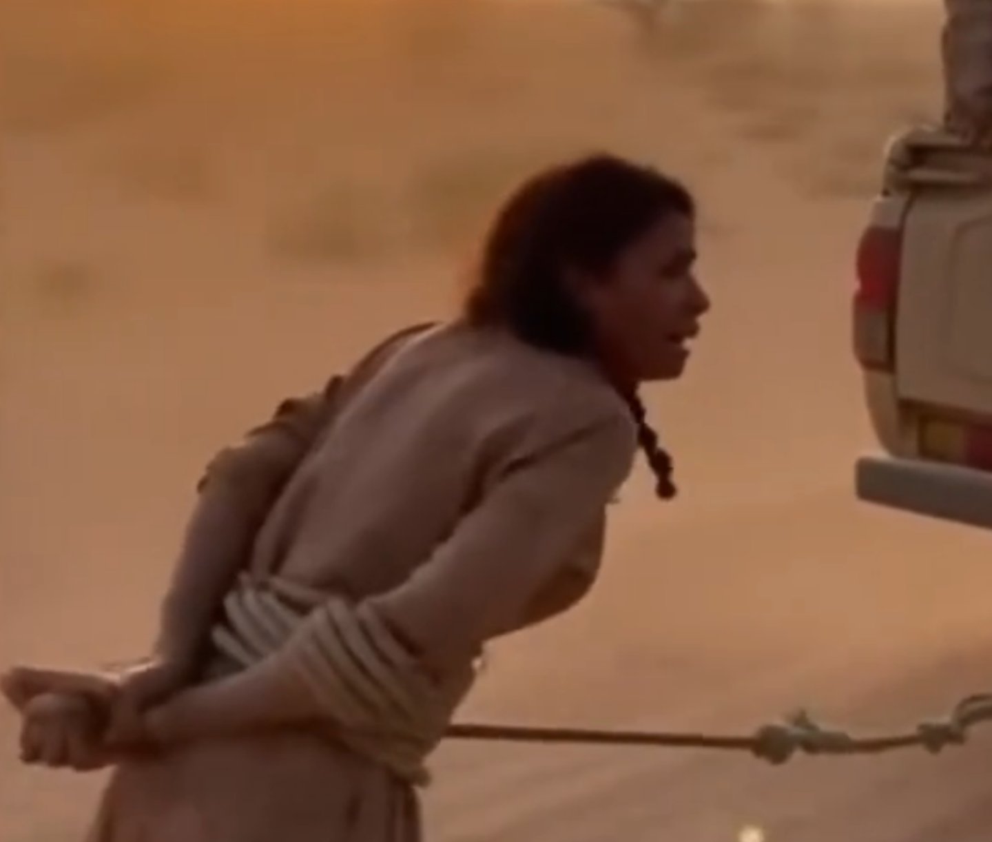 Gönderideki ilk videonun gerçek olup olmadığını sorgulamak için öncelikle tersine görsel arama yöntemini kullanmak gerekiyor. Tersine görsel arama ile aratıldığında TikTok platformunda 10 Kasım 2025’te paylaşılmış üzerinde yazı olmayan bir videoya ulaşılabiliyor. Video dikkatli bir şekilde izlendiği zaman iple elleri arkadan bağlanmış kadının ellerinde bir gariplik olduğu anlaşılıyor. Kumda hareket eden aracın arkasından herhangi bir toz çıkarmaması da bir detay olarak göze çarpıyor.