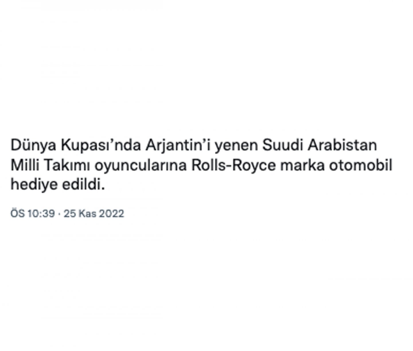 Suudi Arabistan Milli Takım oyuncularına Arjantin’i mağlup ettikleri için Rolls-Royce marka araç hediye edeceği iddiası yanlış.