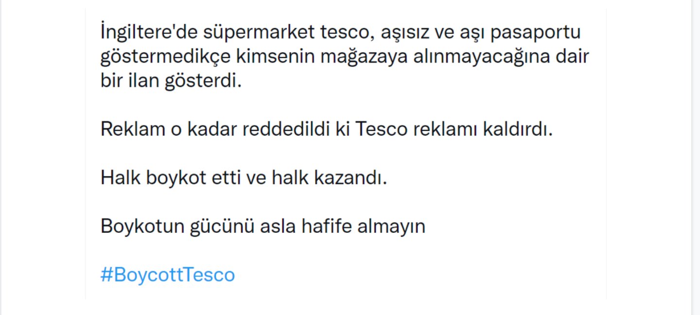 İngiltere'de süpermarket tesco, aşısız ve aşı pasaportu göstermedikçe kimsenin mağazaya alınmayacağına dair bir ilan gösterdi. Reklam o kadar reddedildi ki Tesco reklamı kaldırdı. Halk boykot etti ve halk kazandı. Boykotun gücünü asla hafife almayın #BoycottTesco