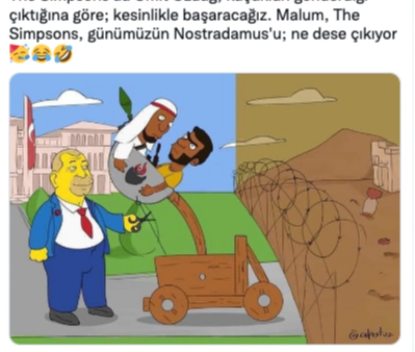 2021 yılında kurulan Zafer Partisi’nin Genel Başkanı Ümit Özdağ, son birkaç ayda sığınmacıların geri gönderilmesine yönelik politikasıyla Twitter’da büyük etkileşimler alıyor. Sosyal medyada yapılan bir paylaşımda da the Simpsons dizisinden alındığı iddia edilen görselin Özdağ’ın sığınmacılara yönelik politikasını gösterdiği iddia edilmiş.