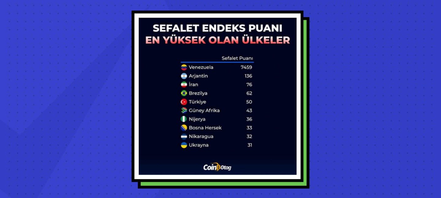 İlgili paylaşımda Türkiye’nin sefalet endeksindeki konumu Hanke Sefalet Endeksi temel alınmış. Burada ise Türkiye 50,6 puanla 5. sırada görünmektedir.