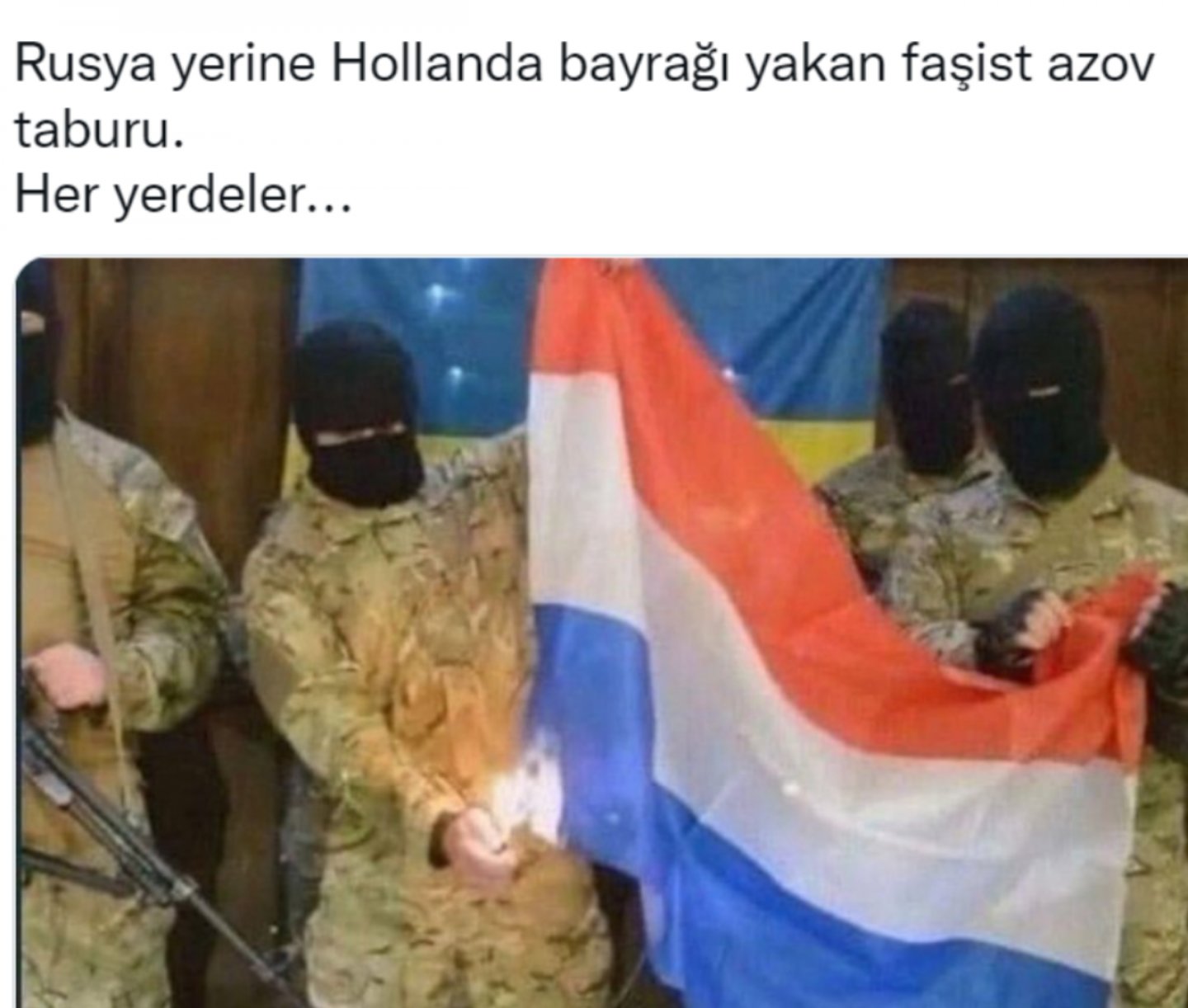 Bir Twitter hesabı tarafından yapılan bir paylaşımda, Ukrayna’daki Azov Taburu’nun Rusya bayrağı yerine yanlışlıkla Hollanda bayrağı yaktığı iddia edilmişti. Resimdeki milislerin bayrak yakma videosunu 2016 yılında Azov Taburu adına paylaştıkları ve yanlışlıkla değil, kasten yaptıkları görülüyor. Fakat, videonun sahte olduğu ve Azov Taburu tarafından yayınlanmadığı tespit edilmiş.