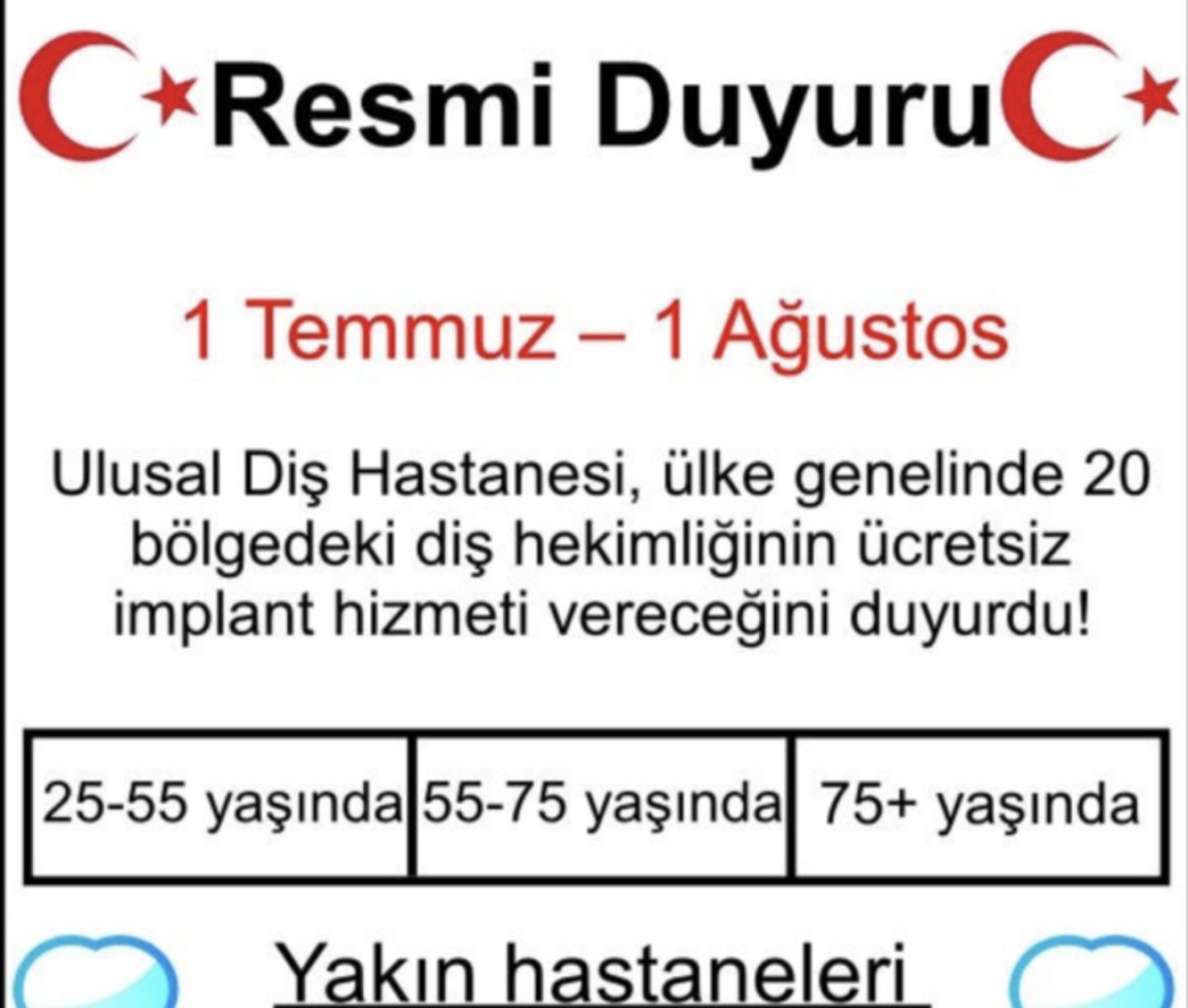 Facebook platformunda dolaşıma giren bu iddiada da “Resmi Duyuru” başlığı altında ülke genelinde 20 bölgede 25 yaşından büyük vatandaşların ücretsiz implant hizmetinden yararlanabileceği iddia edilmiş.