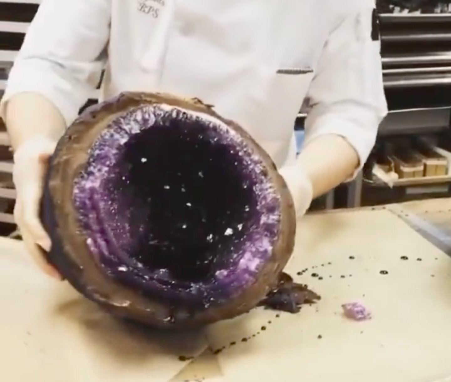 Videodan kesitler tersine görsel arama ile aratıldığında, videonun aslında bir öğrencinin proje ödevini gösterdiği görülüyor. Bu devasa çikolata jeotları, 2017 yılında ABD’deki ABD’deki Culinary Institute of America (CIA) adlı ünlü aşçılık okulunun pasta ve çikolata sanatları öğrencileri Alex Yeatts ve Abby Lee Wilcox tarafından hazırlanmış. Öğrenciler, okullarındaki ileri düzey çikolata ve şeker sanatı dersleri için hazırladıkları proje kapsamında videoda yer alan dev çikolata jeotları üretmişler. Ametist Jeotun dış kısmı çikolata ile, iç kısmı ise şekerlerin kristalize edilmesiyle oluşturulmuş.