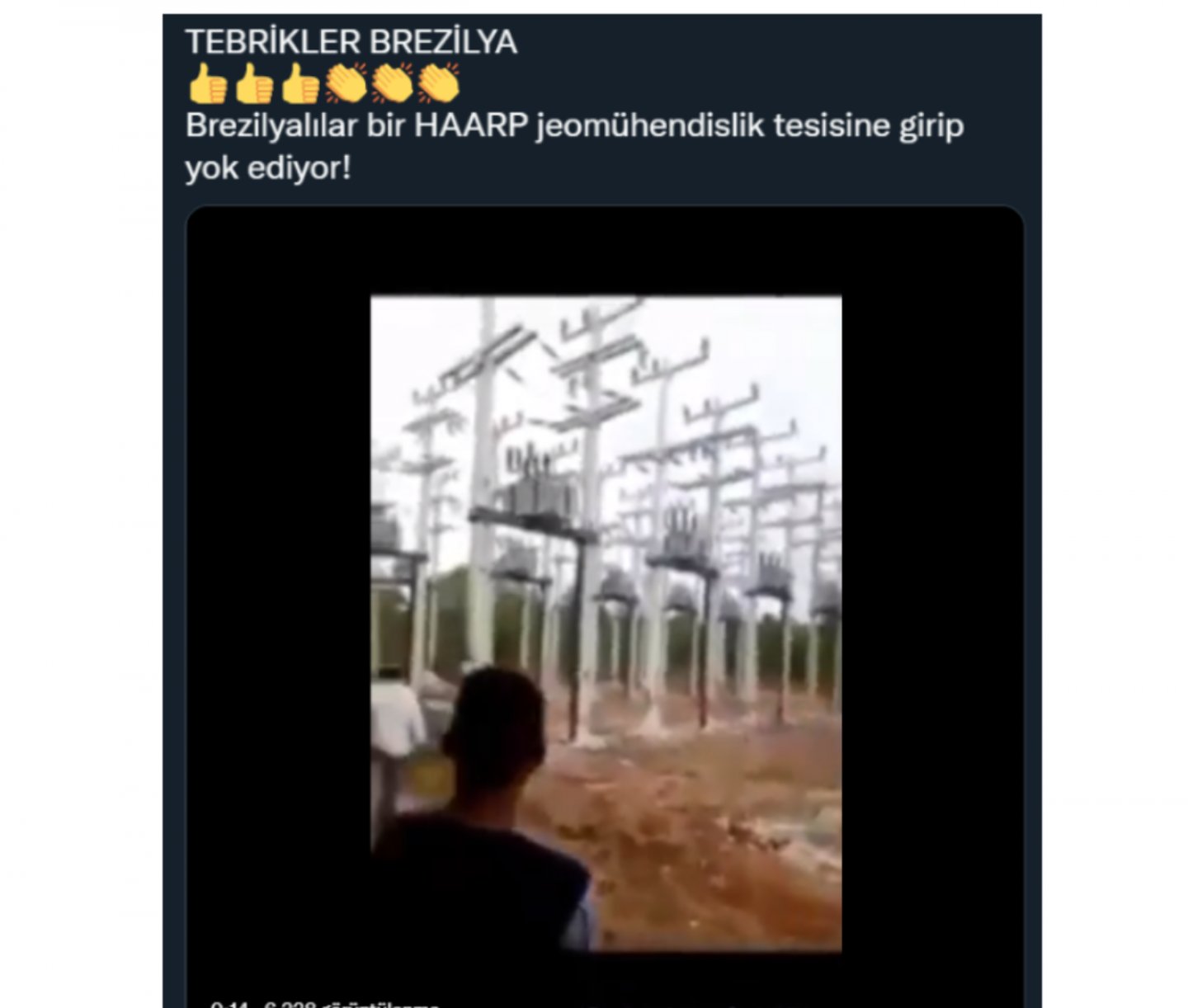 Bir Twitter hesabından yapılan bir paylaşımda, videodaki görüntülerin Brezilya’da bir HAARP tesisinin yıkılışı esnasında çekildiği iddia edilmişti. Brezilya’daki yerel kaynaklar araştırıldığında videonun 2017 yılından kalma eski bir video olduğu ve Bahia’da çiftçiler ile yerel hükümet arasında sulama sistemleriyle ilgili bir anlaşmazlık sonucu oluşan şiddet olaylarında, bir elektrik tesisinin çiftçiler tarafından yıkılışı esnasında çekildiği belirlenebiliyor.