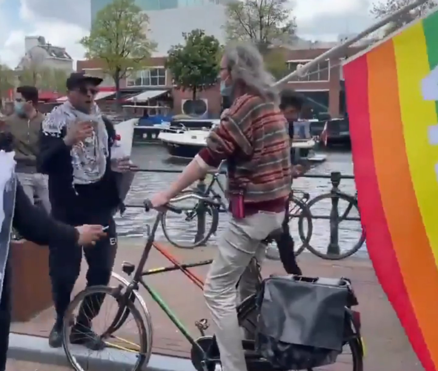 Video, Mayıs 2021’de Amsterdam’da düzenlenen Filistin’e destek eylemleri sırasında kaydedilmiş. Diğer görüntülerde, elinde LGBT bayrağı taşıyan kişinin de eyleme katıldığı görülüyor.