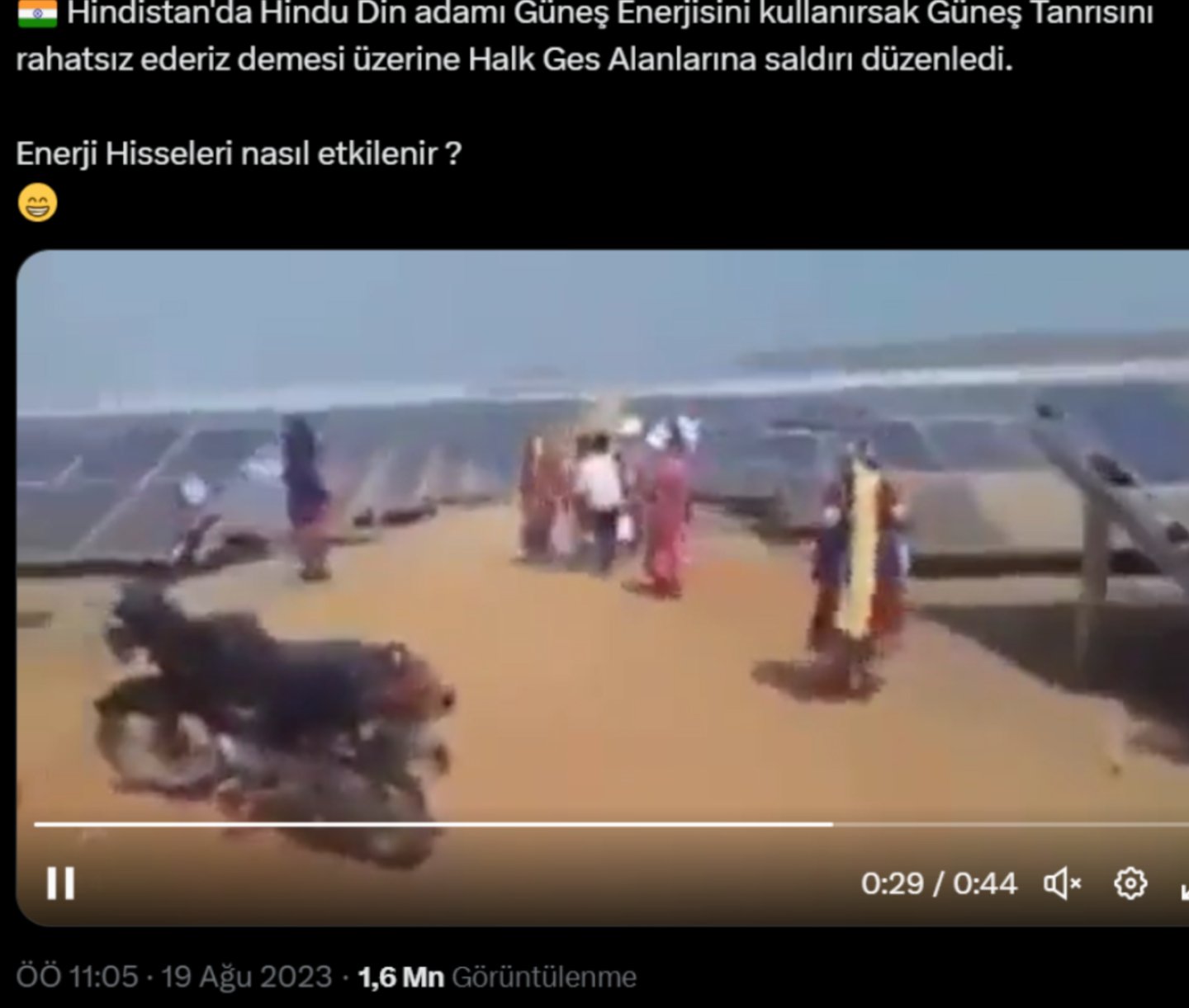 Videonun Hindu bir din adamının “Güneş enerjisi kullanırsak Güneş Tanrısı’nı rahatsız ederiz.” demesi üzerine güneş panellerine saldıran bir grup insanı gösterdiği iddiası yanlış.