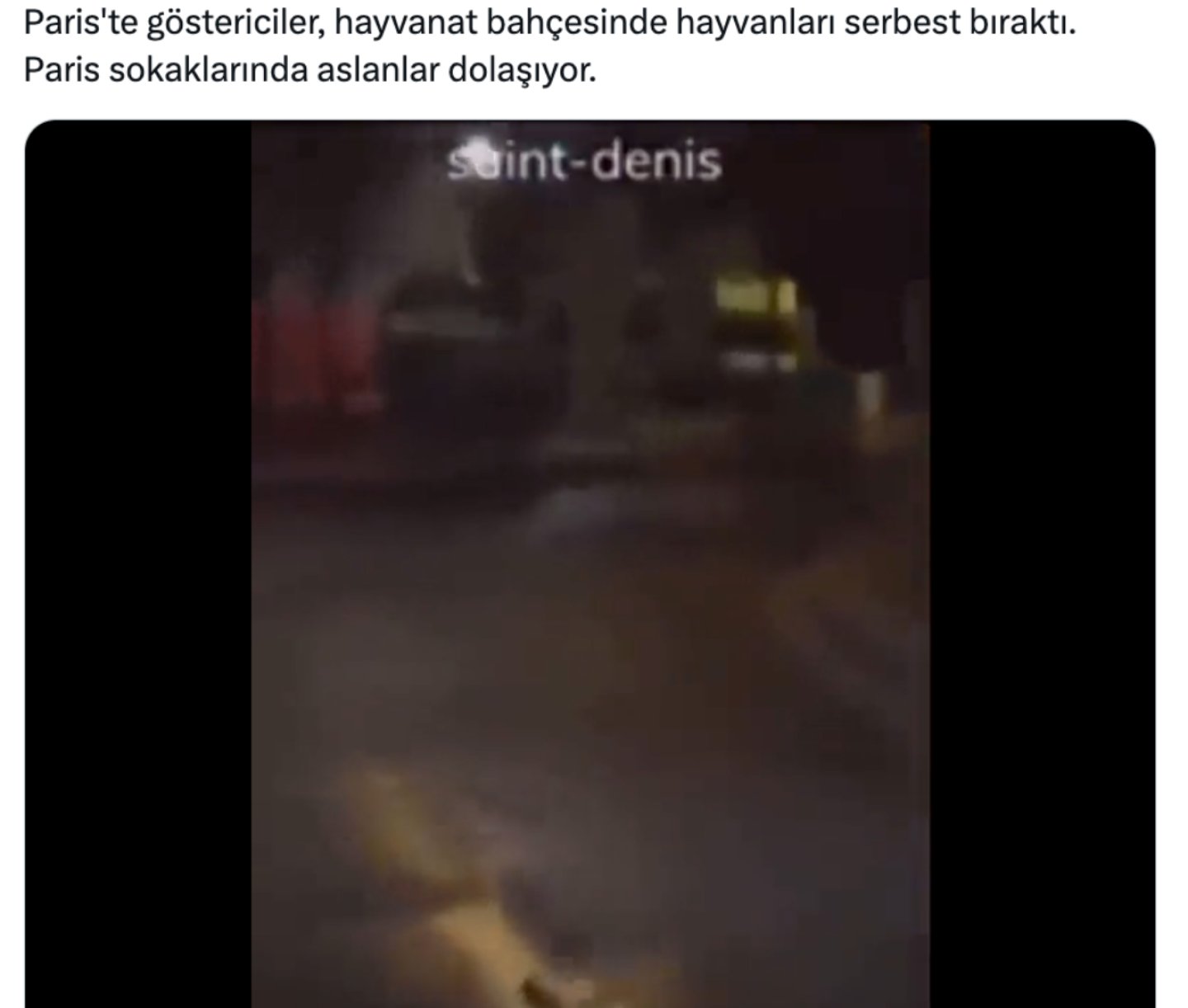 Bir Twitter hesabı tarafından 4 Temmuz 2023 tarihinde yapılan paylaşımdaki videonun Paris’teki protestolar sırasında hayvanat bahçelerinden serbest bırakılan aslanların sokaklarda dolaştığını gösterdiği iddia edildi.