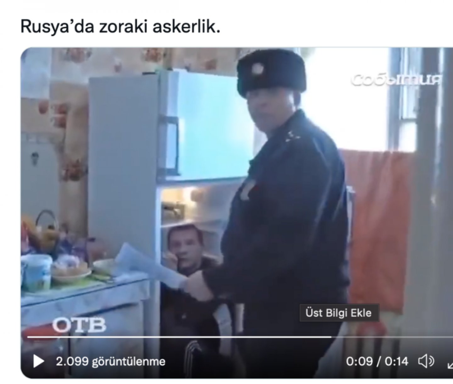 Bir Twitter hesabı tarafından paylaşılan videonun Rusya'da seferberlik ilanının ardından askere alınan kişileri gösterdiği iddia edildi. Rusya Federasyonu Devlet Başkanı Vladimir Putin, seferberlik görevinden kaçanlara yönelik hapis cezasının artırılmasını öngören kararnameyi imzaladı. Kararnameye göre, düşman ordusuna gönüllü teslim olan askerlere 10 yıl, savaş zamanı yağma yapanlara 15 yıl hapis cezası verilebilecek. Kararnameyle, seferberlik zamanında askeri görevden kaçmanın cezası da 5 yıldan 10 yıla çıkarıldı. Bu kararın bazı videolardan Rusya’dan askerlerin kaçtığını gösterdiği iddia edilerek sosyal medyada paylaşıldı. Evdeki insanların buzdolabına saklandığını gösteren iddiadaki video, Putin’in askeri seferberlik emrinin verildiği 2022 yılı Eylül ayında değil 2015 yılında çekilmiş. Videodaki olay Yekaterinburg Rusya’da yaşanan hırsızlık olayı ile alakalı. Zanlı, mahkemeye çıkmamak için buzdolabında saklanmış. Videoda saklandığı yerden onu çıkarmaya çalışan görevliler ise icra memurları.