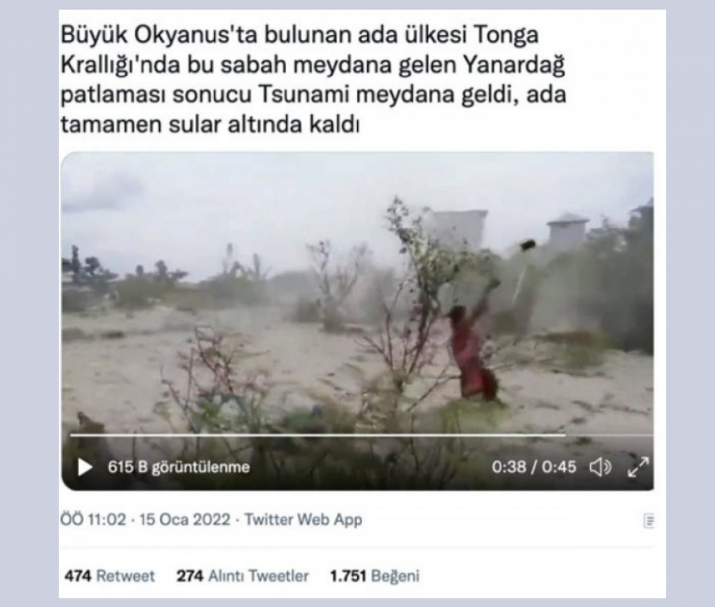 Bir Twitter hesabı tarafından 15 Ocak 2022 tarihinde paylaşılan videonun Tonga’da yaşanan volkanik patlamasının ardından yaşanan tsunamiyi gösterdiği iddia edildi. Paylaşım 474 retweet alırken bin 751 de beğeni toplamış.