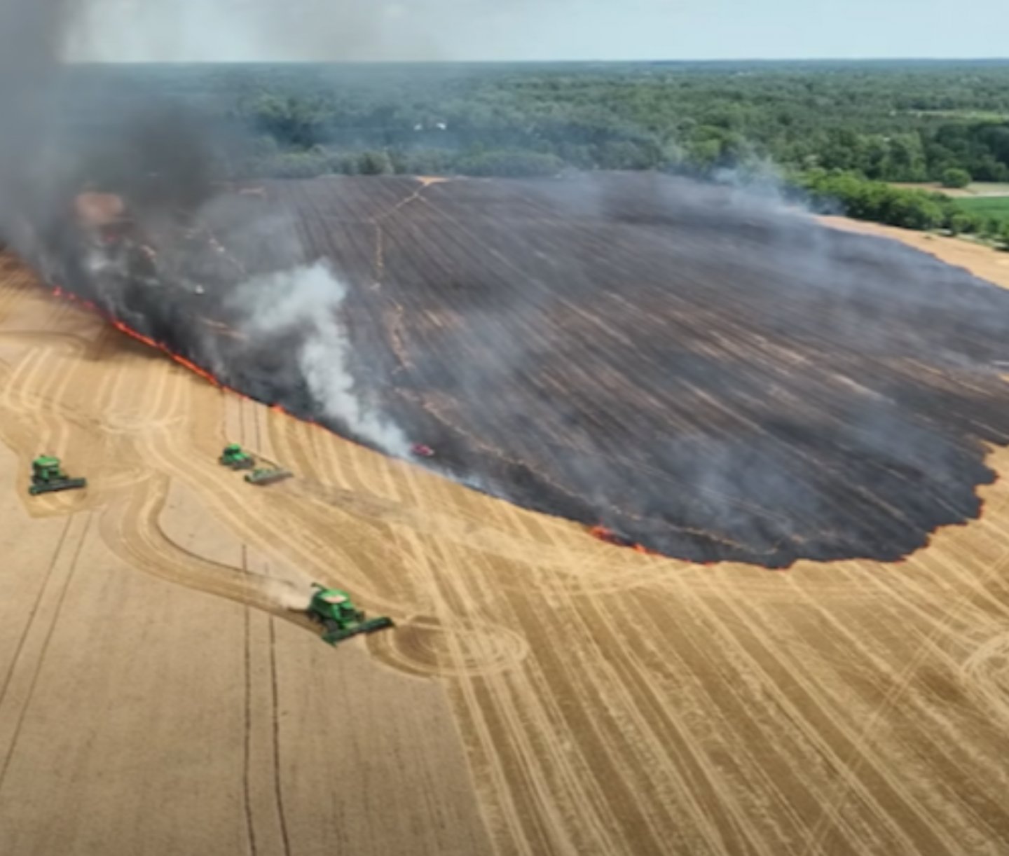 Videonun, Ukrayna’da bir tarlanın Rusya tarafından ateşe verilmesi üzerine mahsulü hasat etmeye çalışan biçerdöverleri gösterdiği iddiası yanlış.