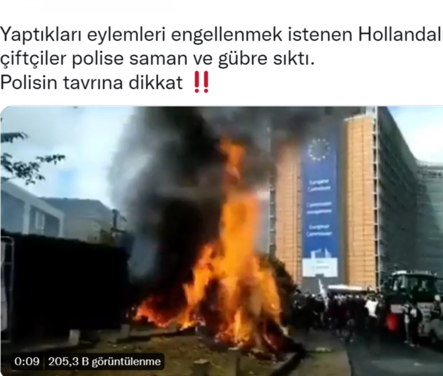 Bu da protestoların Hollanda’da değil, Belçika’da gerçekleştiğini gösteriyor. Dahası, Avrupa Komisyonu Binası önünde çiftçilerin yaptığı protestolar için arama yapıldığında ise çeşitli haberlere ulaşmak mümkün. BBC tarafında yapılan haberde, Belçika, Fransa ve Almanya da dahil Avrupa’nın çeşitli ülkelerinden gelen çiftçilerin ürünlerinin fiyatlarının çok hızlı bir şekilde düşmesini protesto ettikleri belirtiliyor. Dahası, iddiada paylaşılan videodaki gibi çiftçilerin polisler üzerine saman attıkları görüntüler de mevcut.