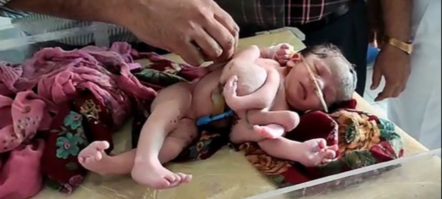 Videodan alınan ekran görüntüleri arama motorlarında tersten aratıldığında Hindistan’da yayın yapan Jabgani adlı haber sitesindeki 21 Eylül 2019 tarihli habere ulaşılıyor. Haberde bebeğin Hindistan’ın kuzeyinde bulunan Racastan eyaletinde 20 Eylül 2019 tarihinde doğduğu belirtilmiş. Haber metninde Rajudevi Gudhar adında bir kadının biri erkek biri kız olmak üzere ikiz doğurduğunu, ilk doğan erkek bebeğin tamamen sağlıklı olduğu ancak kız çocuğunun dört kollu ve dört bacaklı doğduğu yer almış. Doktorlar kadının rahminde üç fetüs taşıdığını söylerken, gelişimini tamamlayamayan fetüsün kız bebeğin karnına bağlandığı açıklamasında bulunmuş.