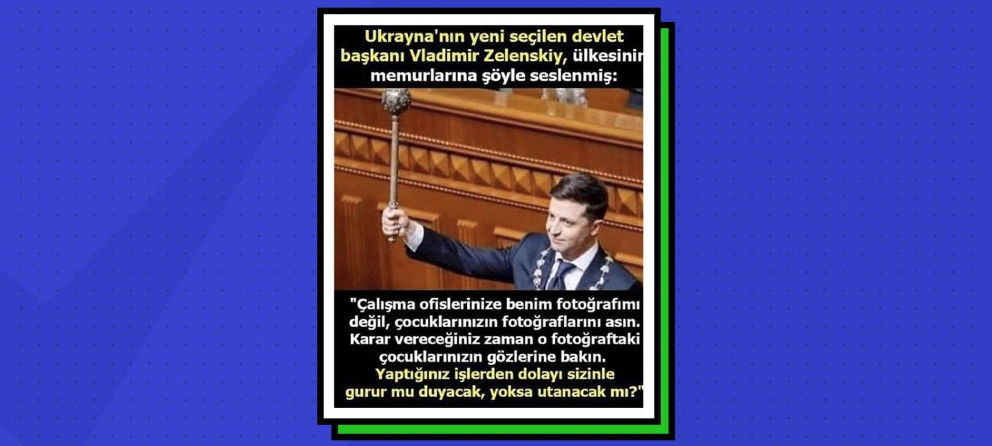 Bir Facebook sayfası tarafından 6 Ekim 2020 tarihinde yapılan paylaşımda Ukrayna devlet başkanı Volodimir Zelensky’nin, memurlara çalışma ofislerinize benim fotoğrafımı değil, çocuklarınızın fotoğrafını asın dediği iddia edildi. Gönderi 370 binden fazla görüntülenme 3 binden fazla paylaşım almış.