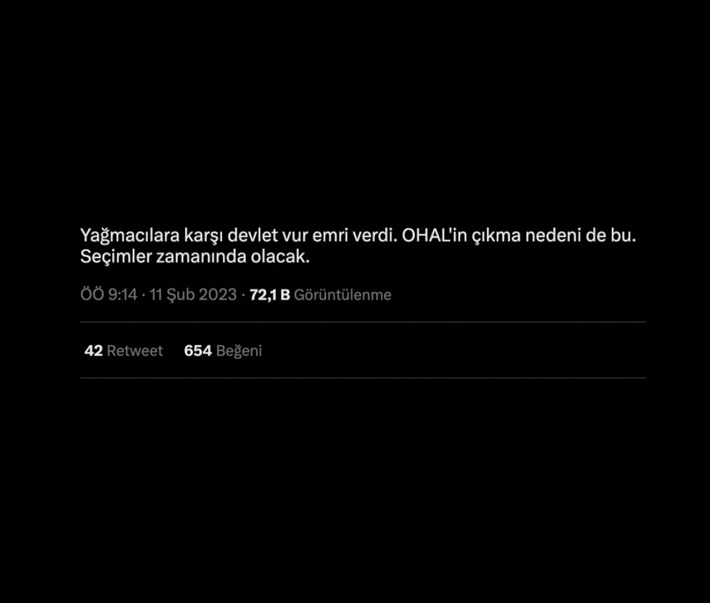 Bir Twitter hesabından 11 Şubat 2023 tarihinde yapılan paylaşımda devletin yağmacılara karşı “vur emri” verdiği iddia edildi.