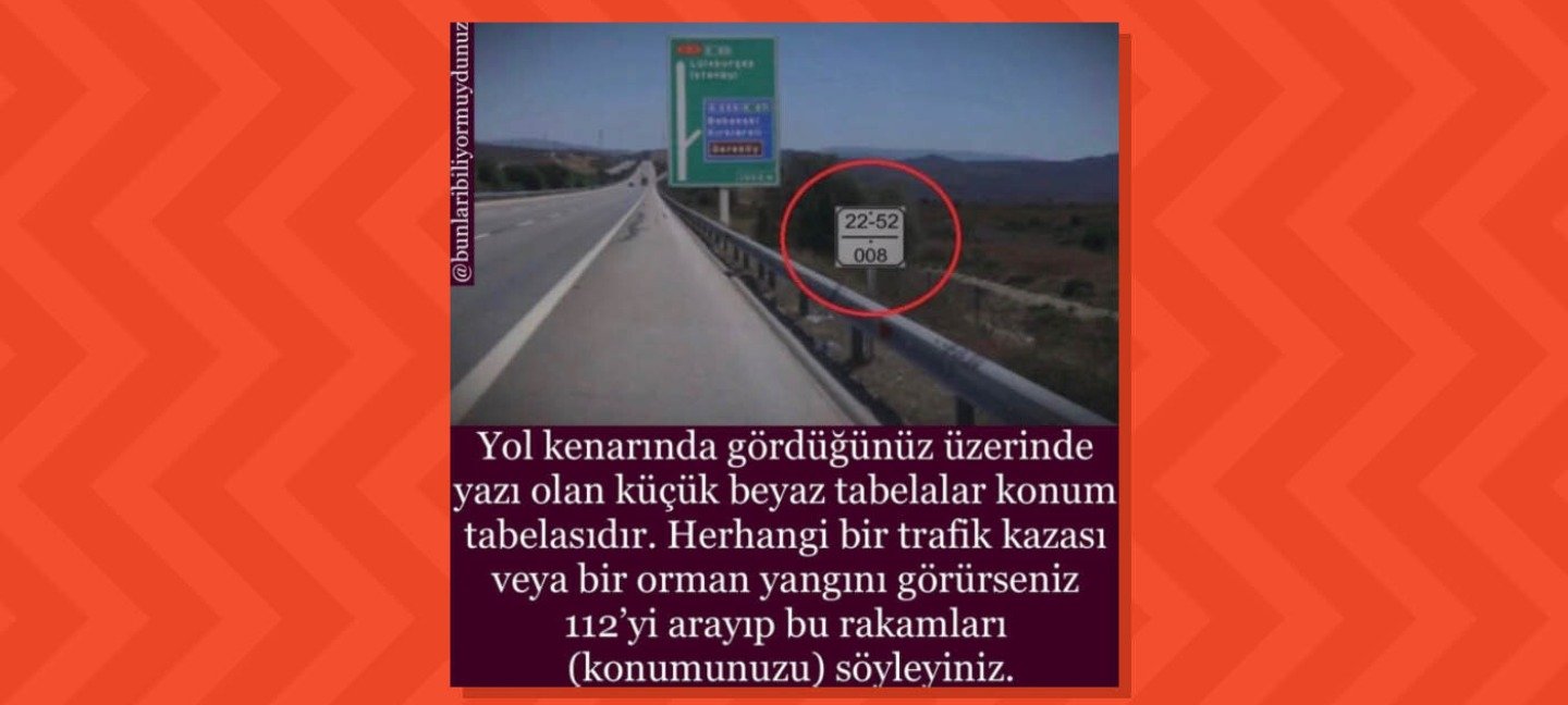 Bir Instagram sayfası tarafından yapılan paylaşımda yol kenarında bulunan küçük beyaz tabelaların konum tabelası olduğu iddia edilmişti. Karayolları Genel Müdürlüğü Trafik İşaretleme Standartları 2020 kitapçığında yer alan ifadeye göre bu işarete kontrol kesim levhası deniliyor. Olası bir acil durum anında bu tabeladaki bilgileri paylaşarak olayın meydana geldiği konuma yardım çağırmak mümkün.