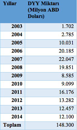 Tablodaki veriler 1970 yılından başlıyor. Yani Bakan Yılmaz’ın iddiasındaki gibi 2003 yılından önceki 80 yılın tablosuna ulaşamıyoruz. Fakat 1970 ile 2003 yılları arasında gelen DYY miktarı 15.3 milyar dolar olarak hesaplanıyor. Bu açıdan bakıldığında, her ne kadar daha öncesine ilişkin veriye ulaşamasak da, 1970 öncesinde de bir miktar DYY olduğunu düşünürsek, toplamdaki miktarın 15 milyarın üstünde olması gerekiyor. Bakan Yılmaz’ın iddiasının ilk kısmında doğruluk payı yok.
